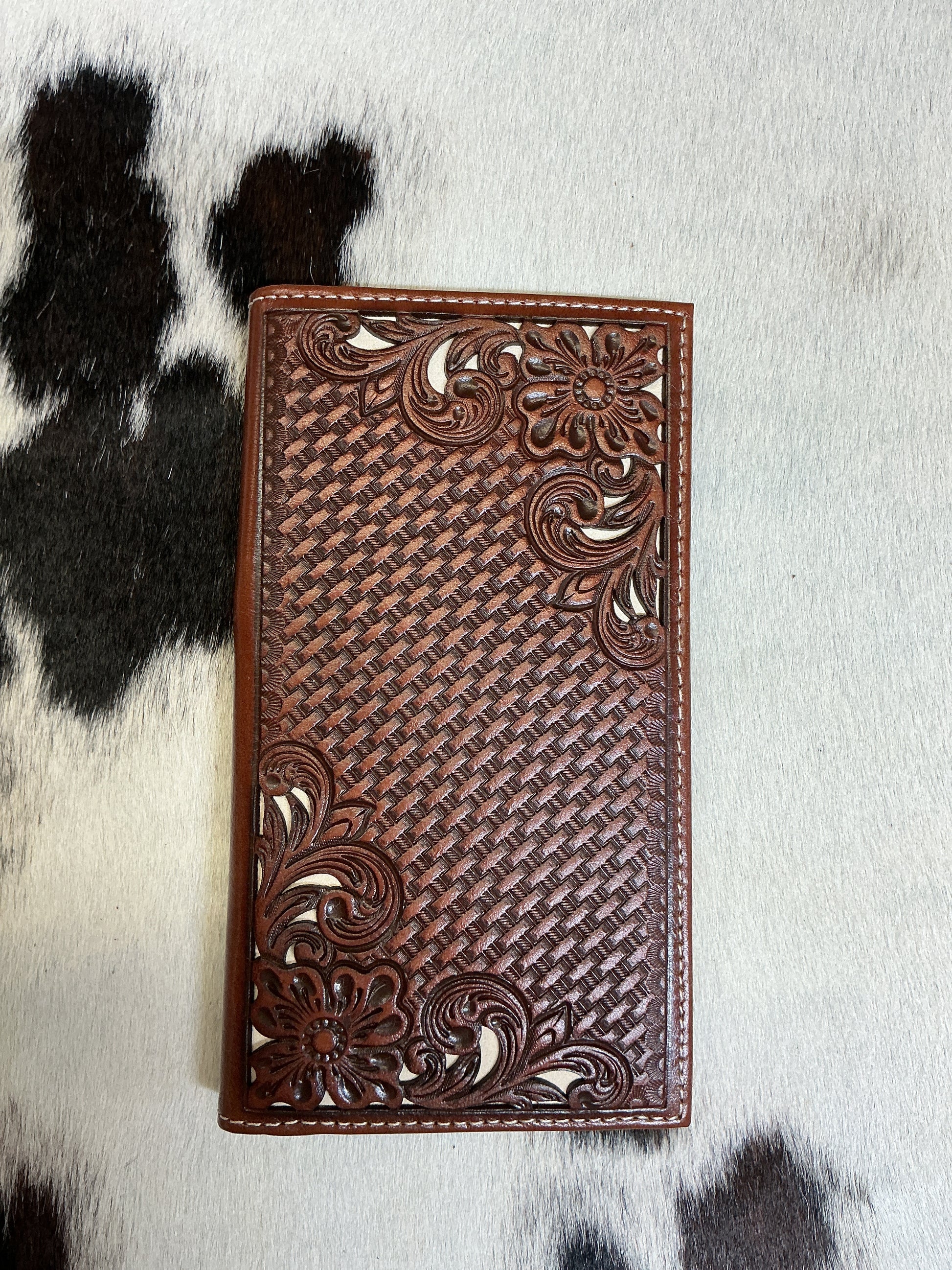 Floral carved leather checkbook wallet. Measures 7“x 4“. Inside has multiple pockets for cards and long pockets for cash or a checkbook.