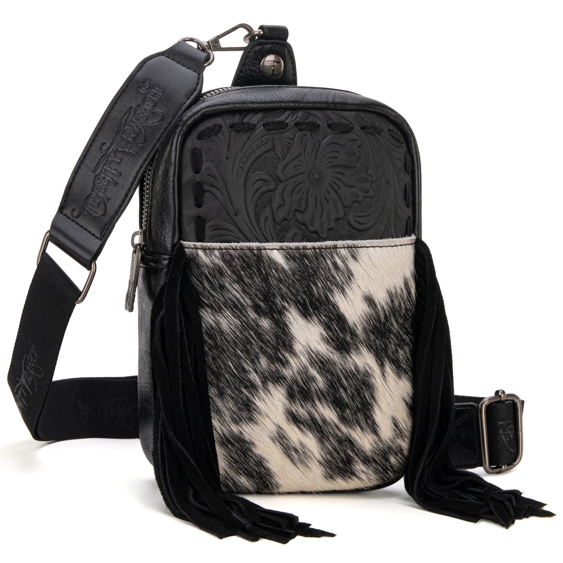 Trinity Ranch Genuine Hair-On Cowhide Tooled Fringe Sling Bag