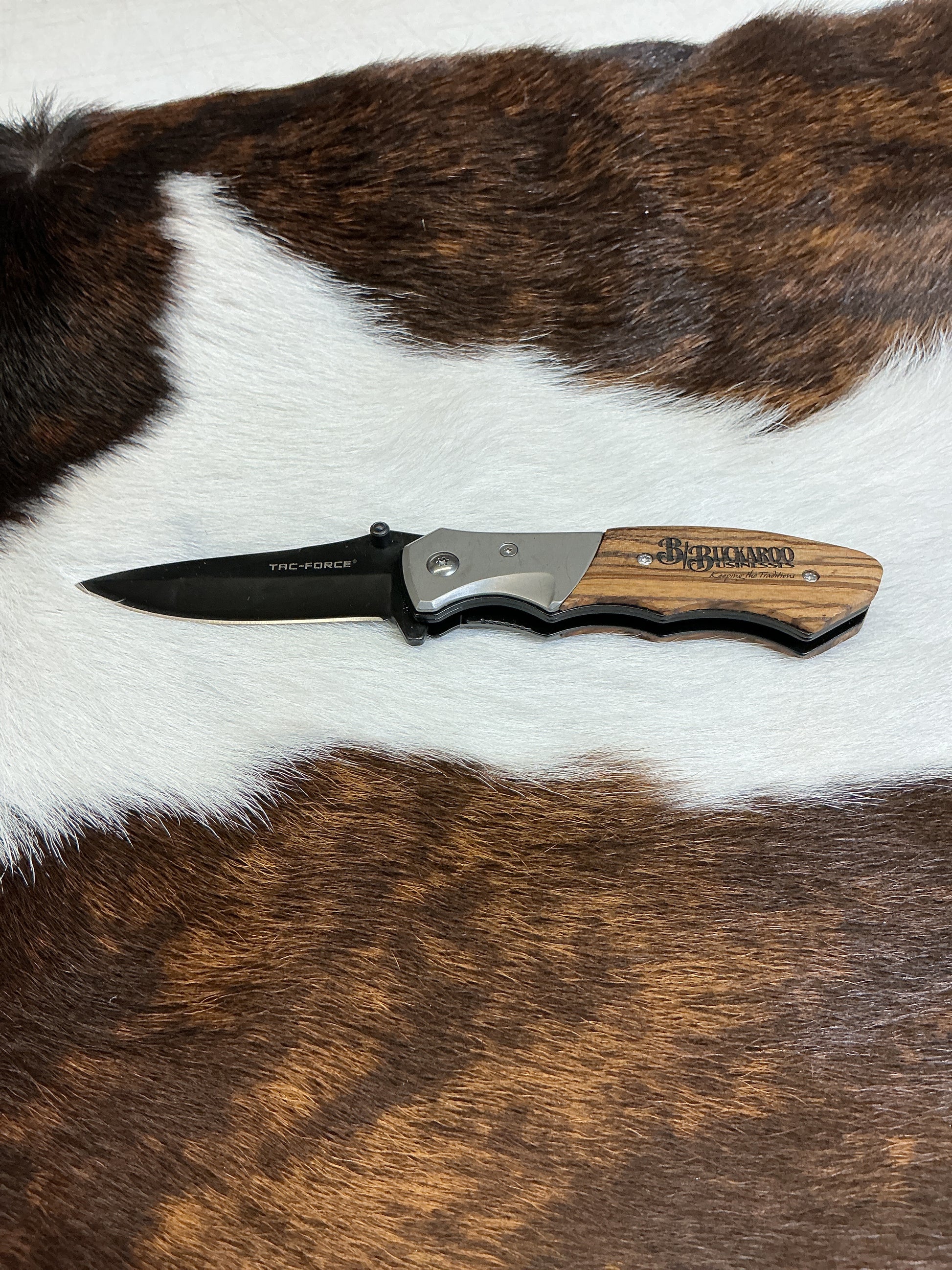 Single blade folding knife with Buckaroo Businesses logo on a wooden handle. The handle is 4 1/2" long and the blade is 3 1/4" long.