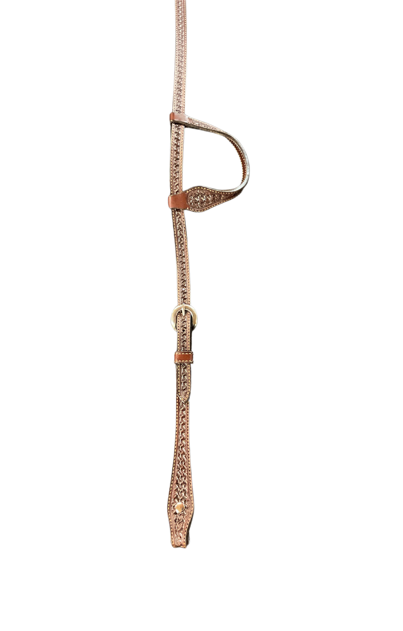 Single ear basket stamped headstall with stainless buckles on both sides and Chicago screw bit hangers. Available in light or dark variations.