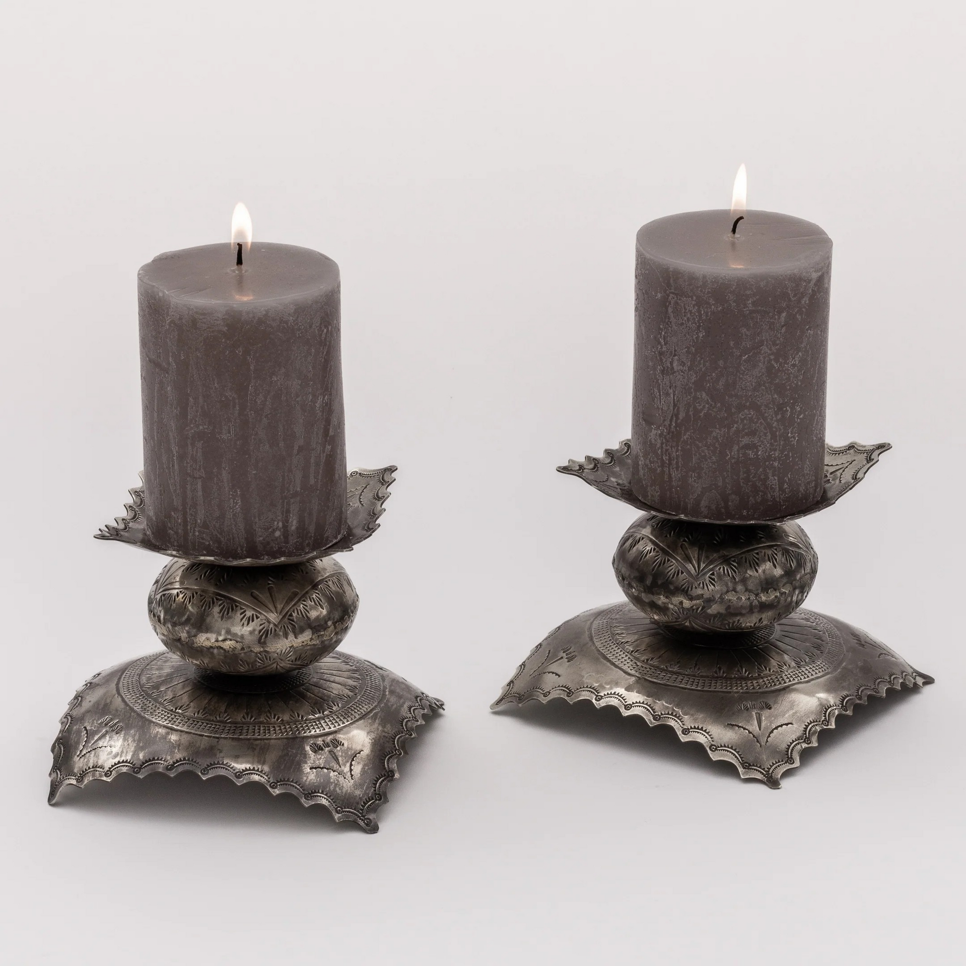 Drawing inspiration from the rich history of Navajo silversmiths, each candle holder features a unique vintage finish that exudes authenticity and timeless appeal. Whether you're looking to upgrade your home decor or surprise a loved one with a thoughtful gift, these candle holders are sure to impress.