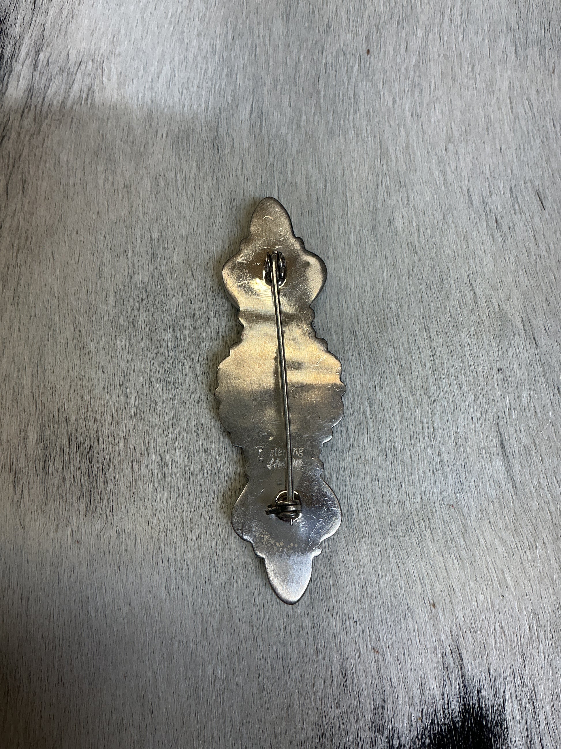 Discover the timeless elegance of our Sterling Silver and Kingman turquoise pin. Crafted from high-quality material, this versatile accessory features an intricate design and measures 2 1/2" x 3/4". Elevate your style with this exquisite piece today! The HaDa Collection is a handcrafted, artisan jewelry line inspired by Western styles.