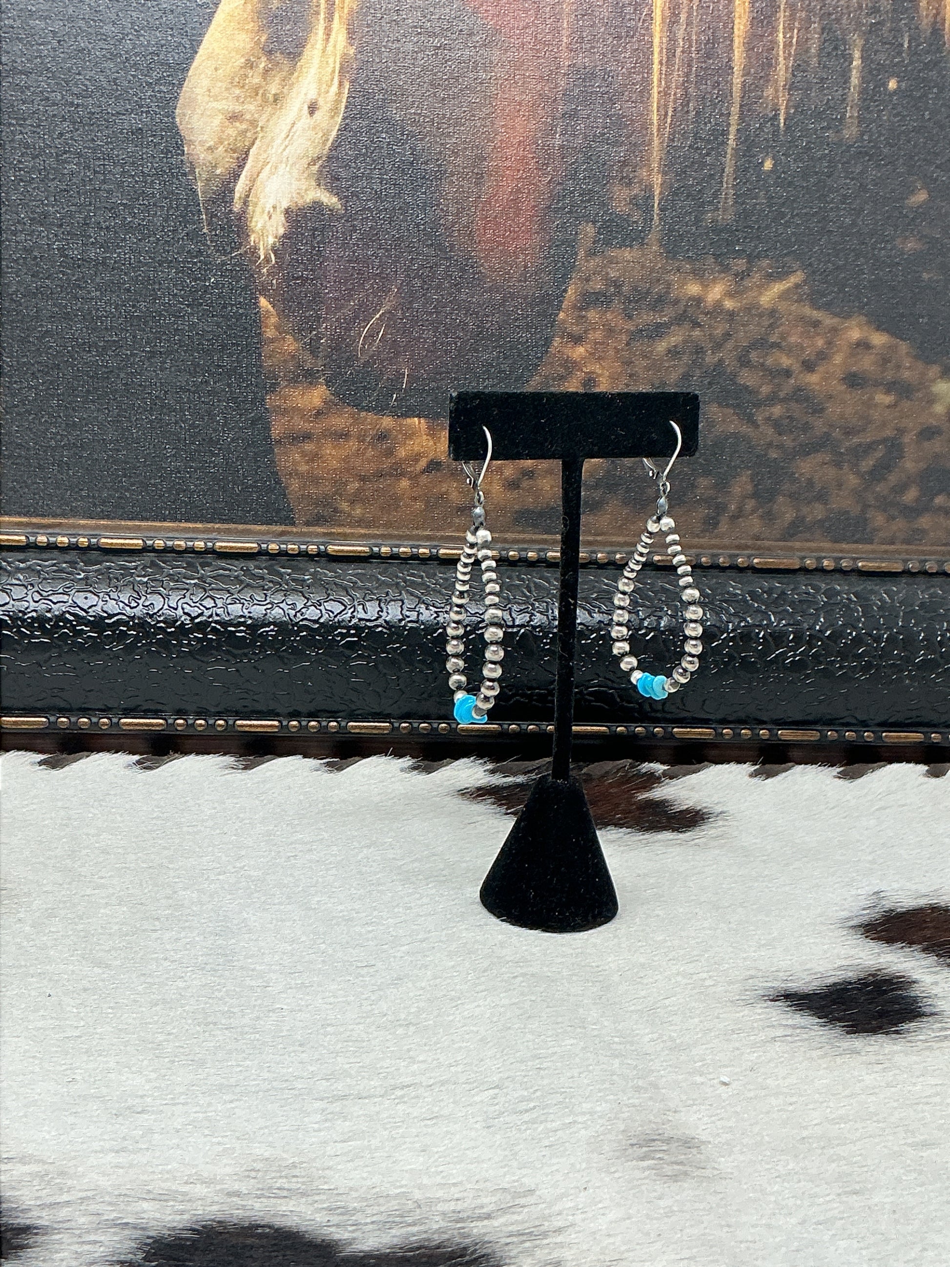 These elegant Navajo pearl dangle hoops showcase traditional Navajo craftsmanship with three lustrous turquoise stones set in precious metal. Measuring 2 1/4" in length, they offer a graceful drop that frames the face beautifully. The combination of authentic sterling silver and turquoise detailing creates a timeless piece suitable for both everyday wear and special occasions. A versatile addition to any jewelry collection that honors classic southwestern design.