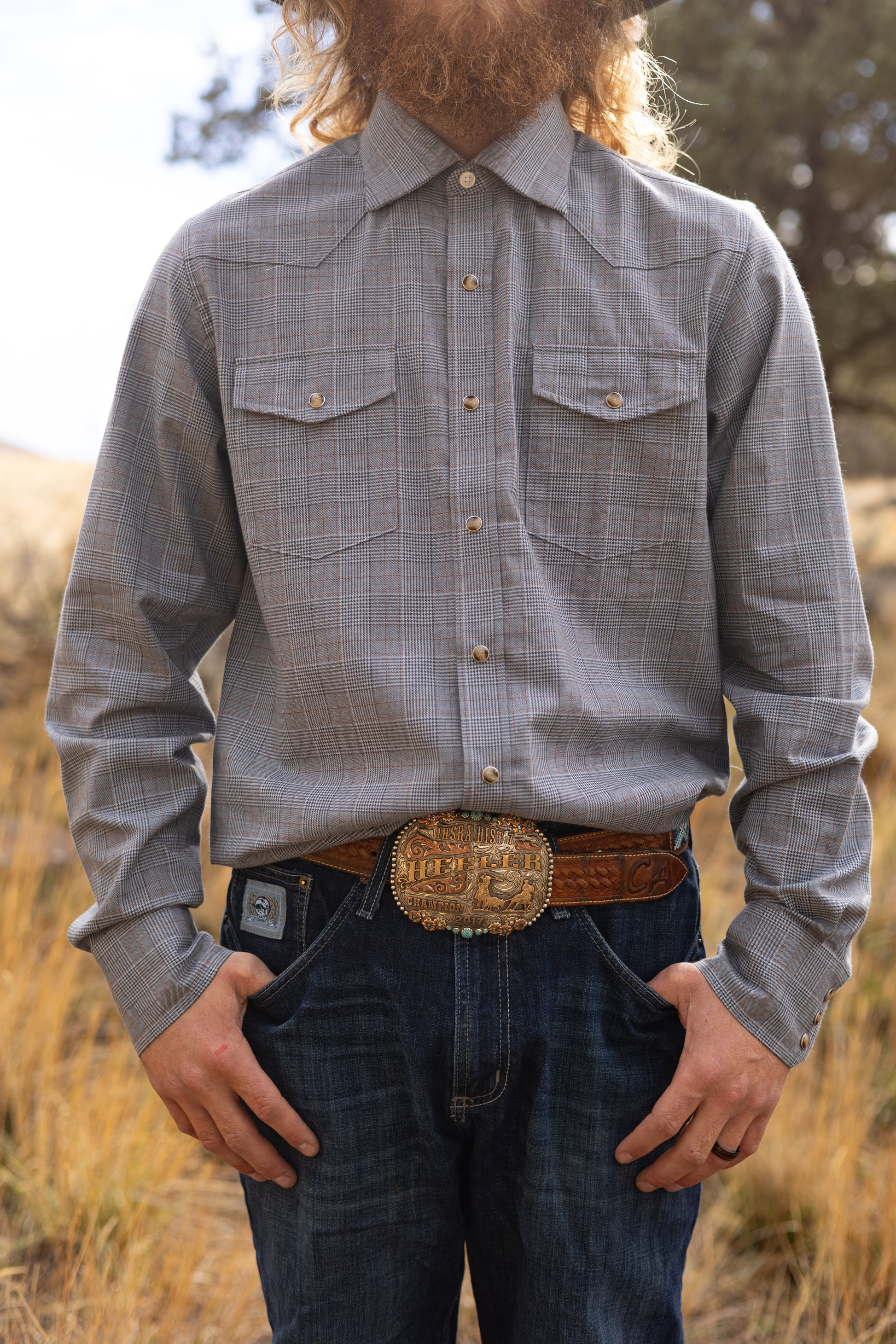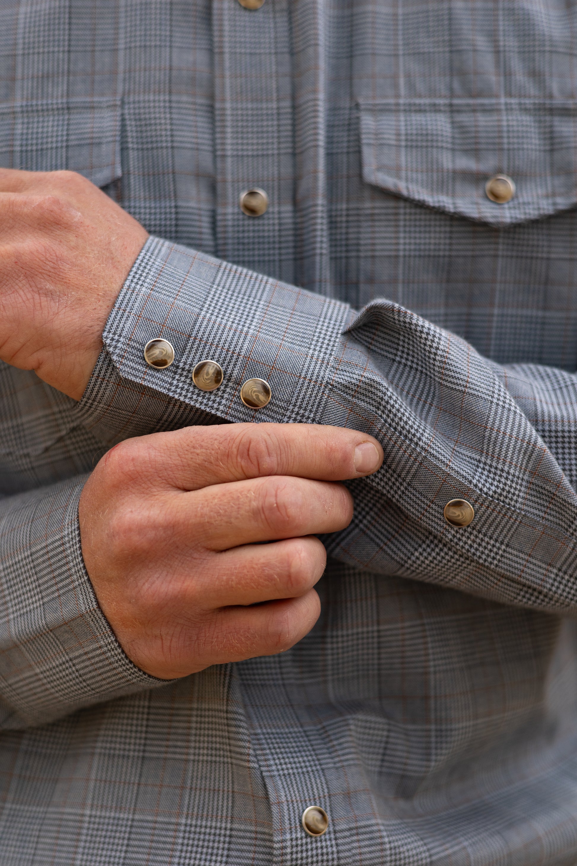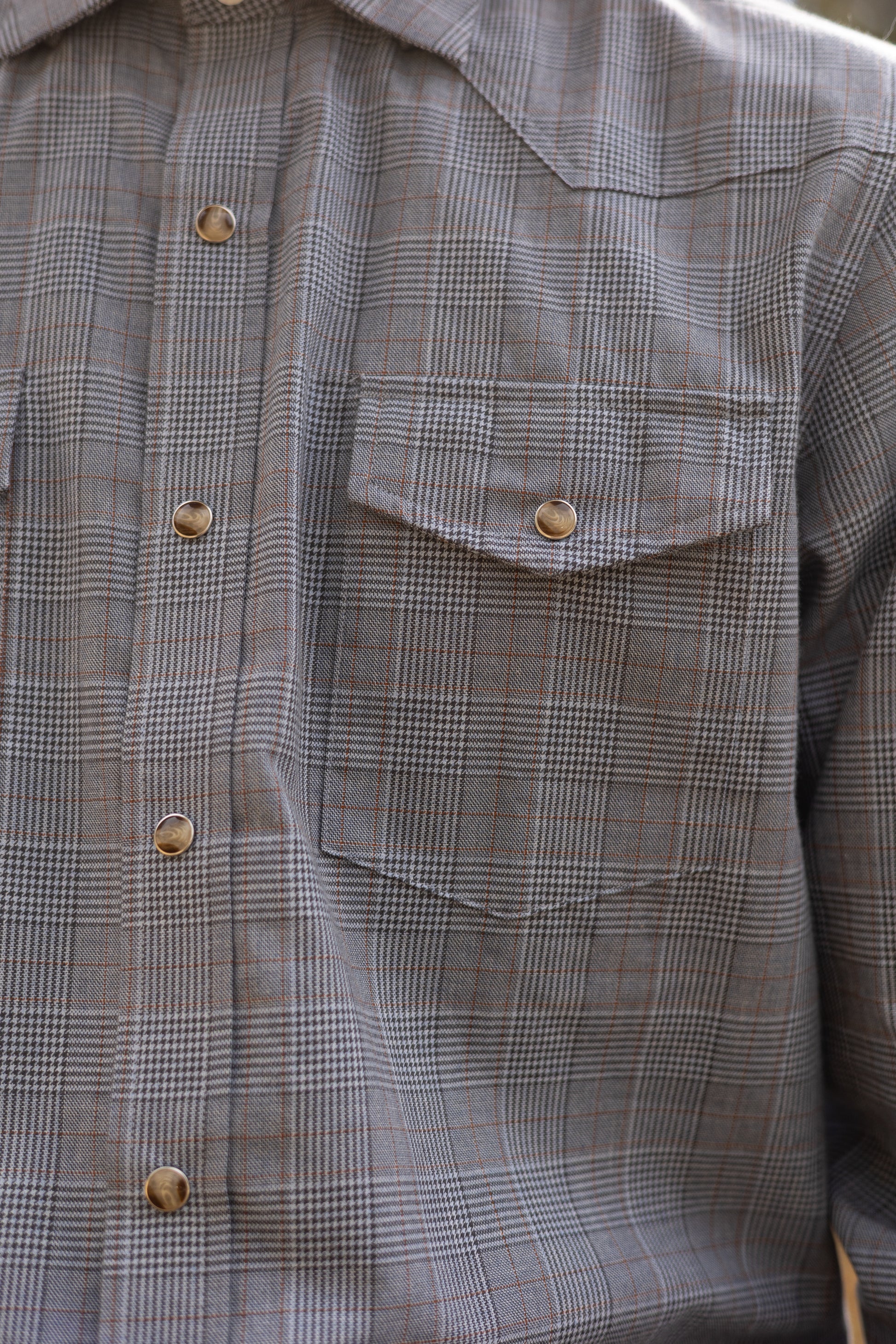 Steel Grey Plaid with Rust Colored Accents Wrinkle Resistant Fabric with Brown Pearl Snaps