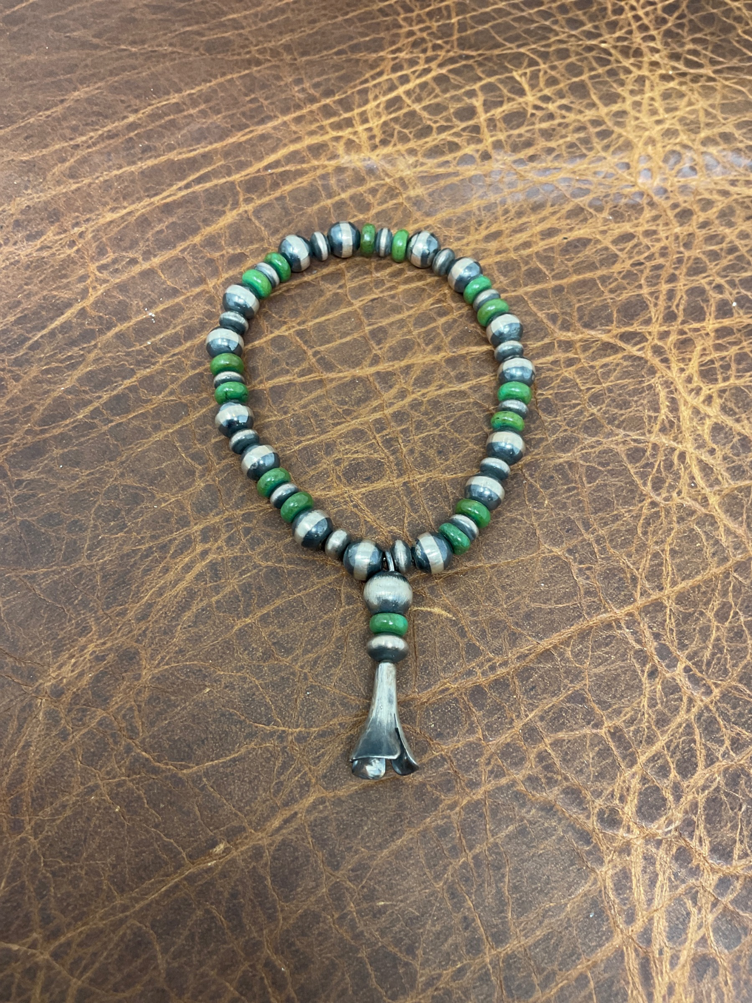 Introducing The Zoey - a stunning bracelet featuring Navajo pearls, green coral accents, and a charming squash bell charm. This stretchy bracelet is a perfect blend of elegance and style, making it a must-have accessory for any occasion.
