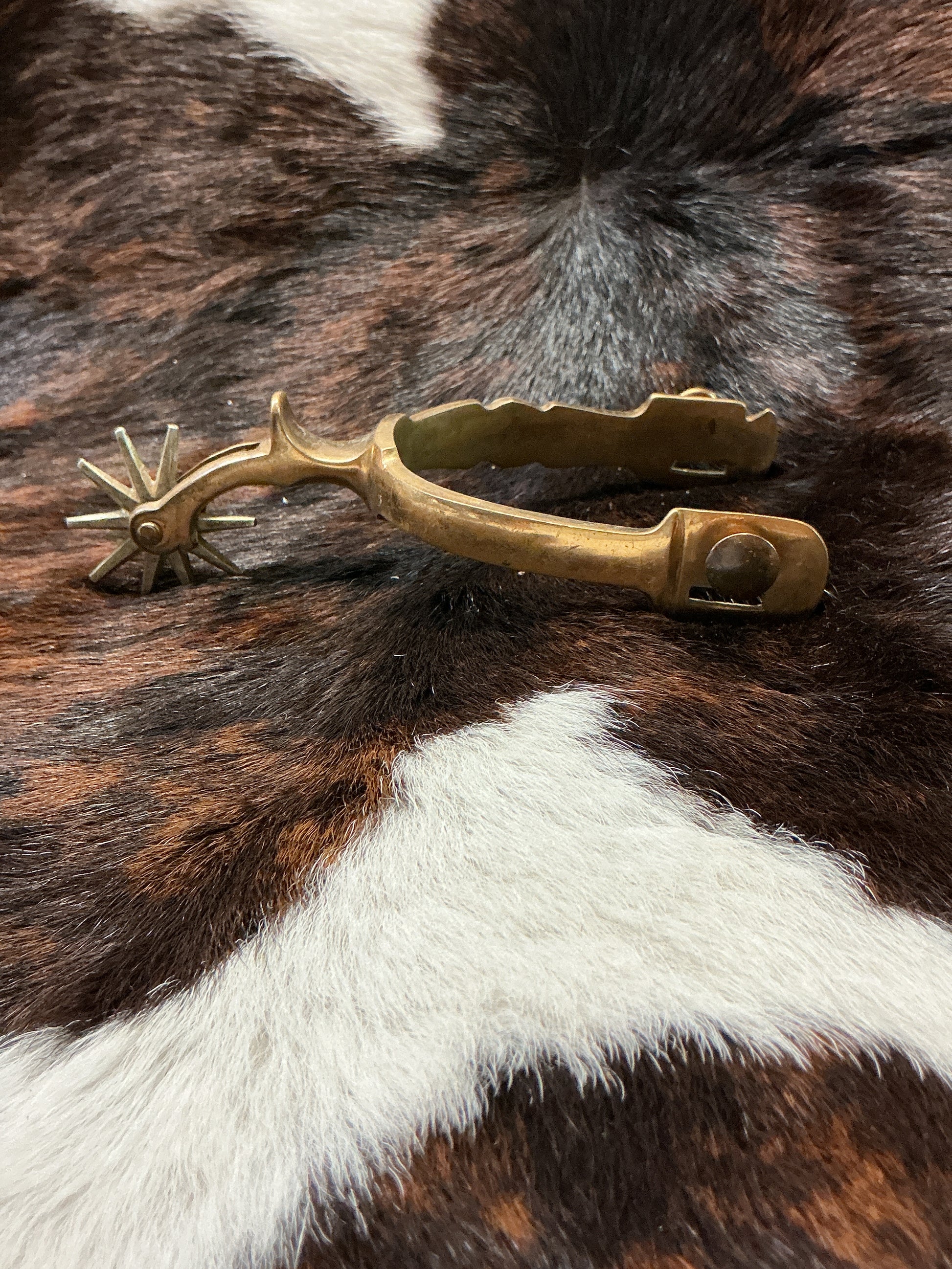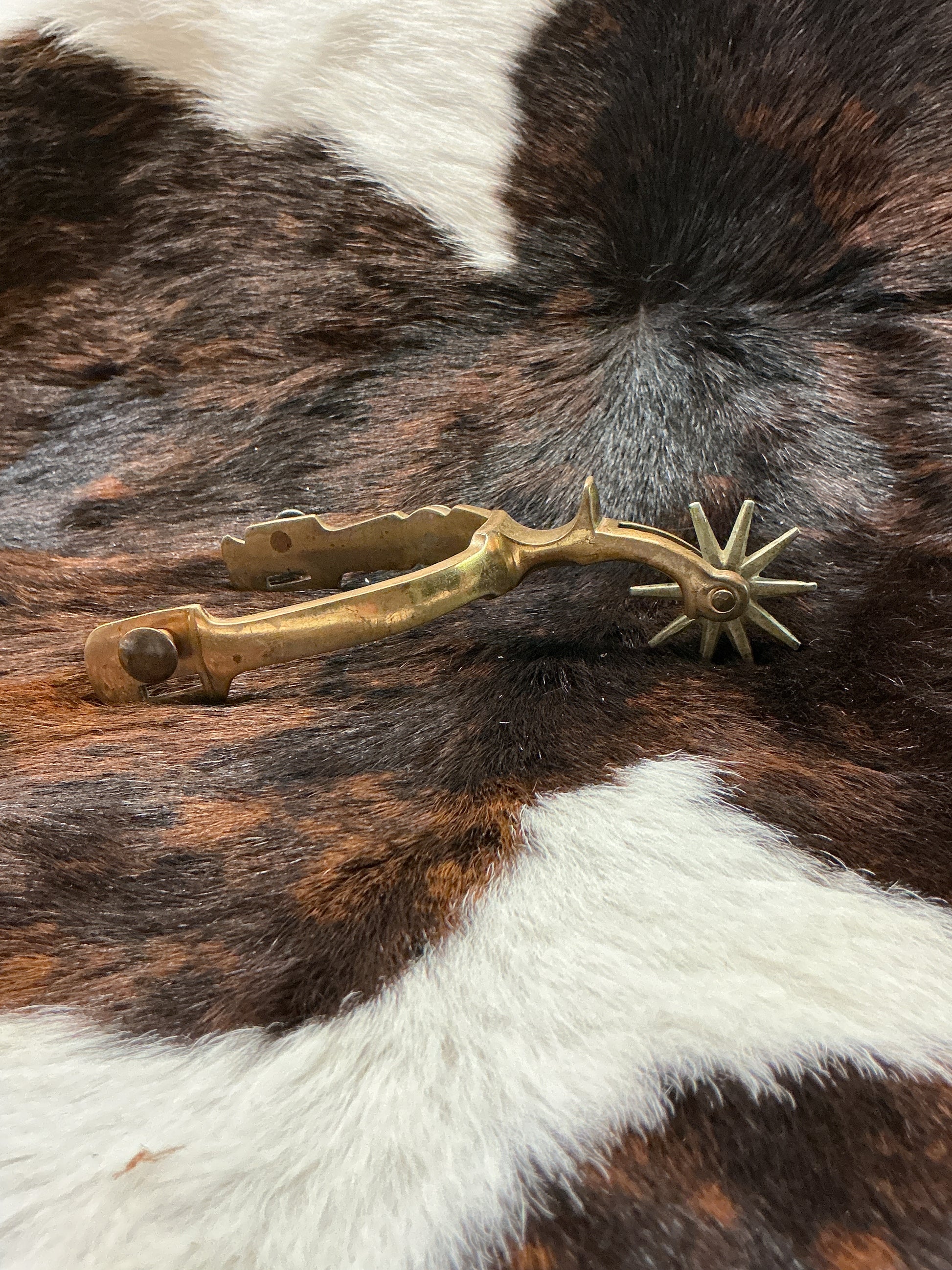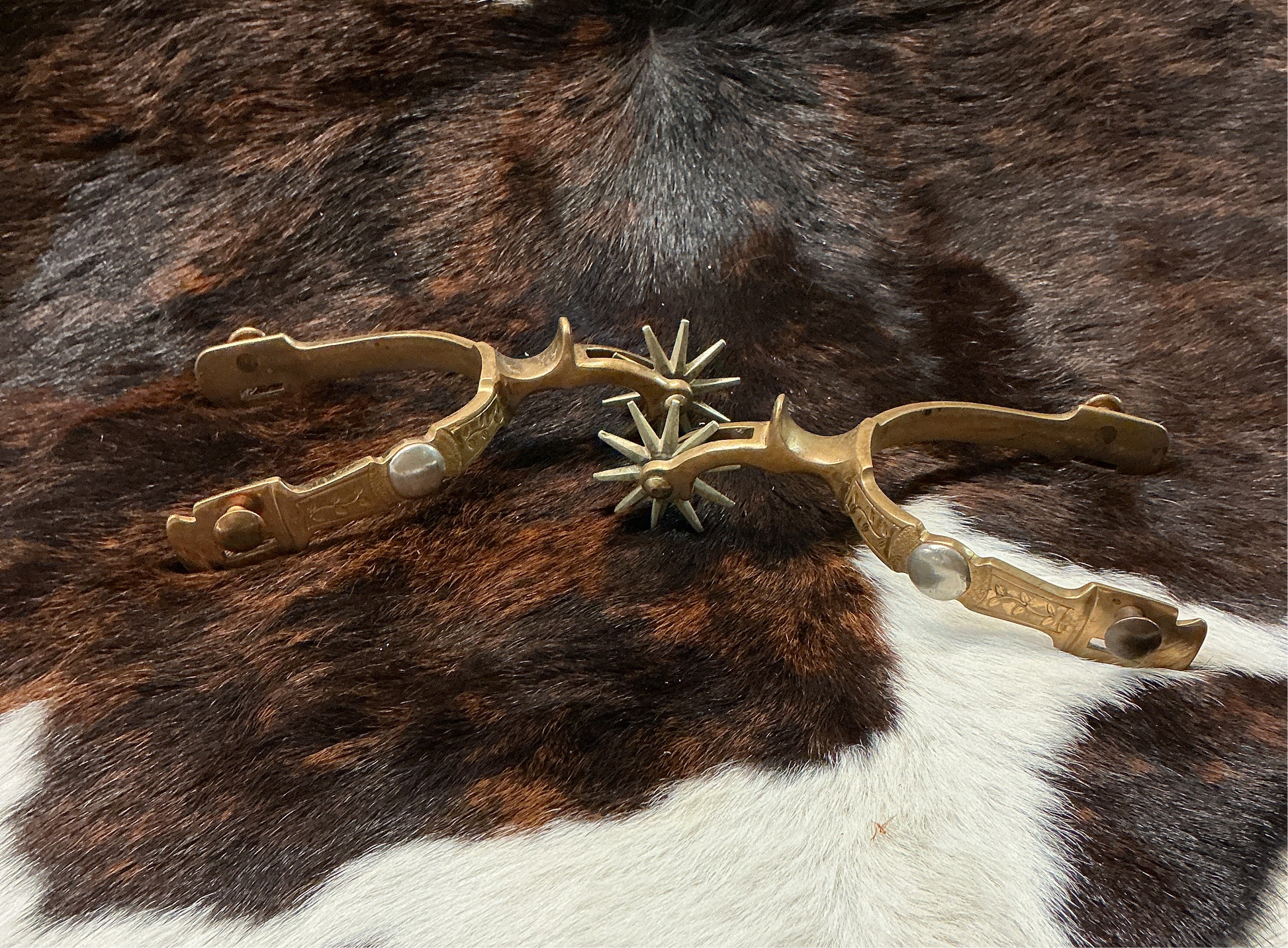 Vintage brass spurs with silver button and 1 3/4” rowels.