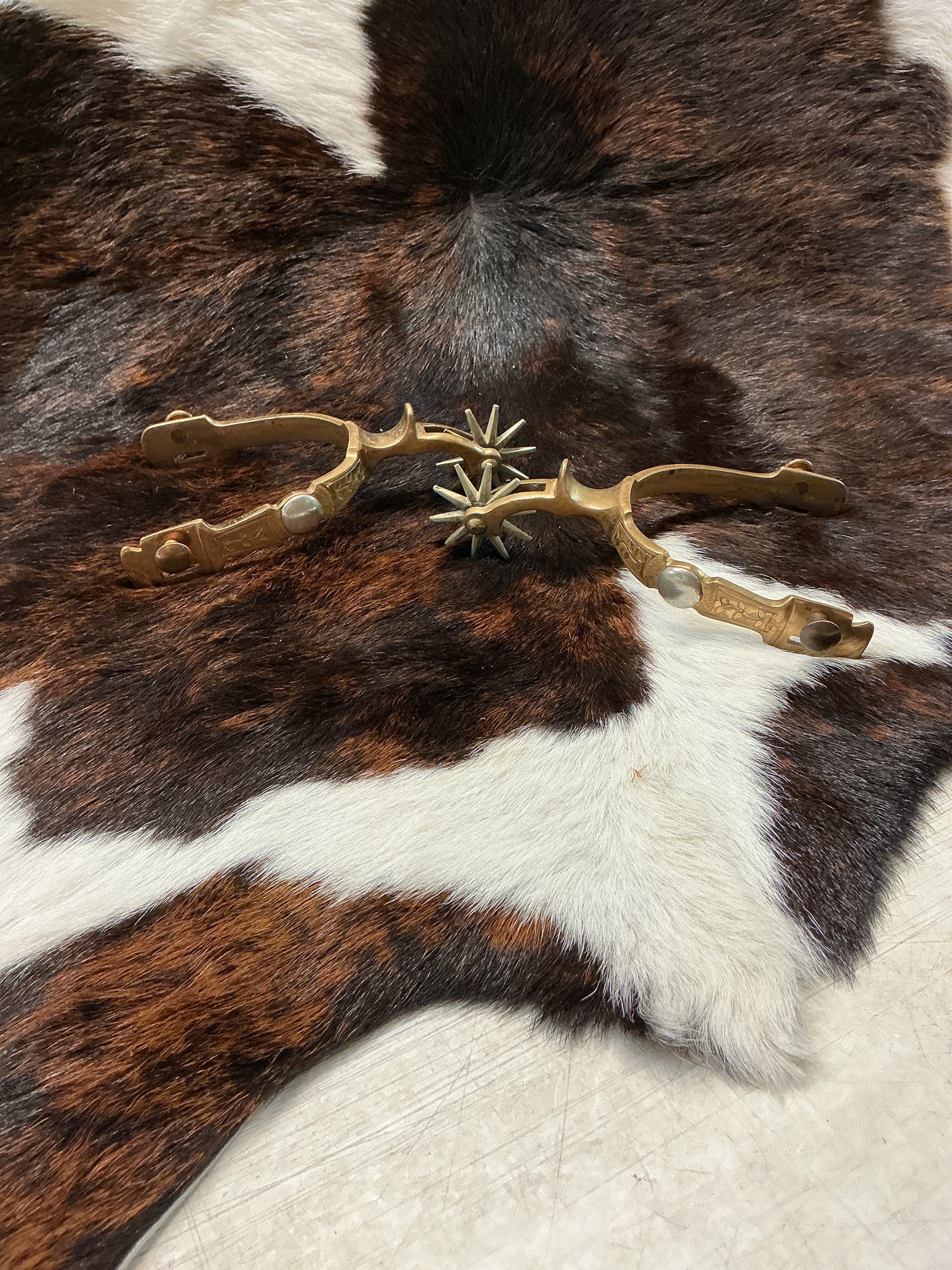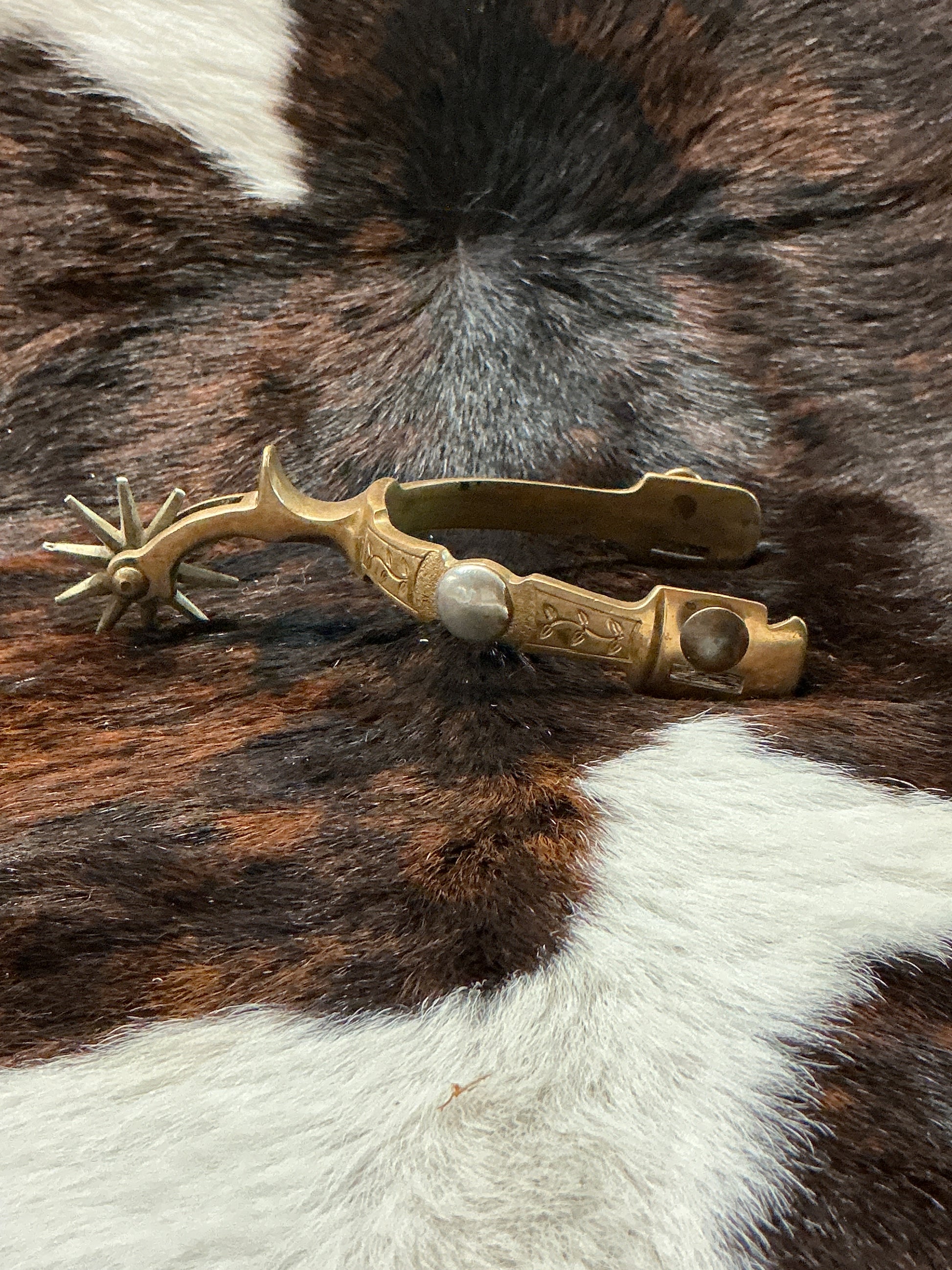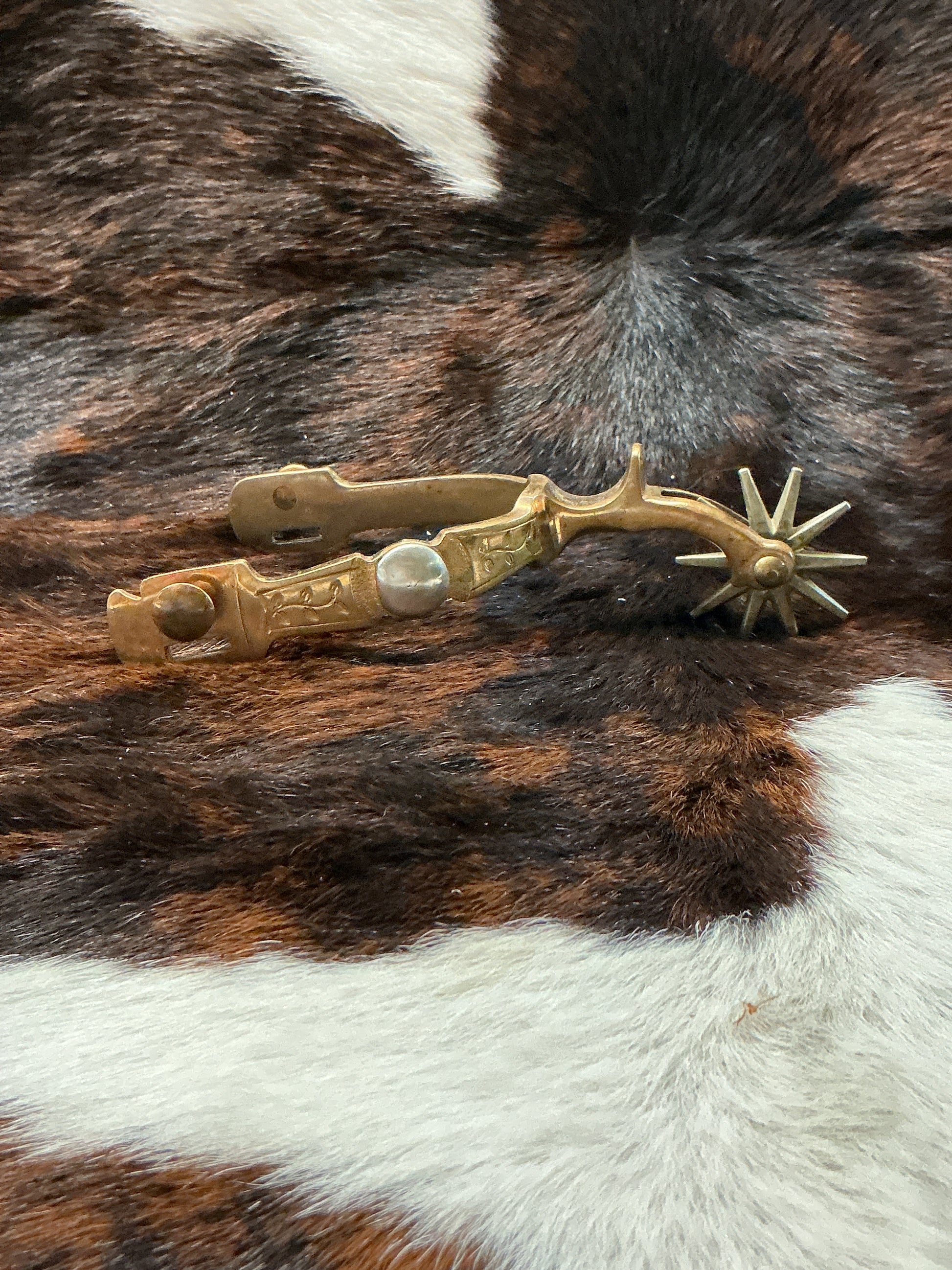 Vintage brass spurs with silver button and 1 3/4” rowels.