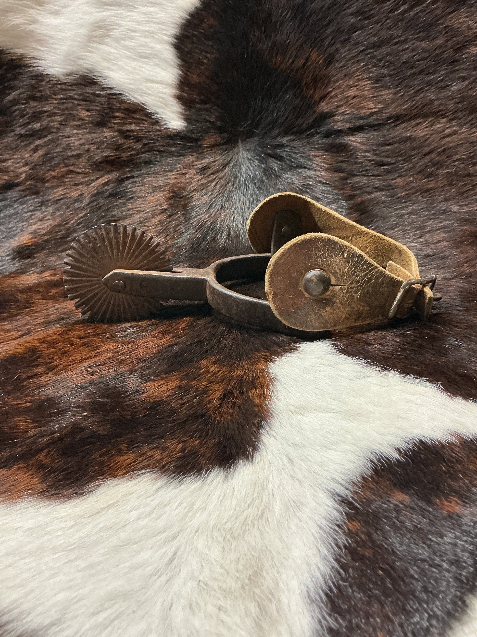 Vintage spurs with 2 1/2” rowels and leather spur straps.