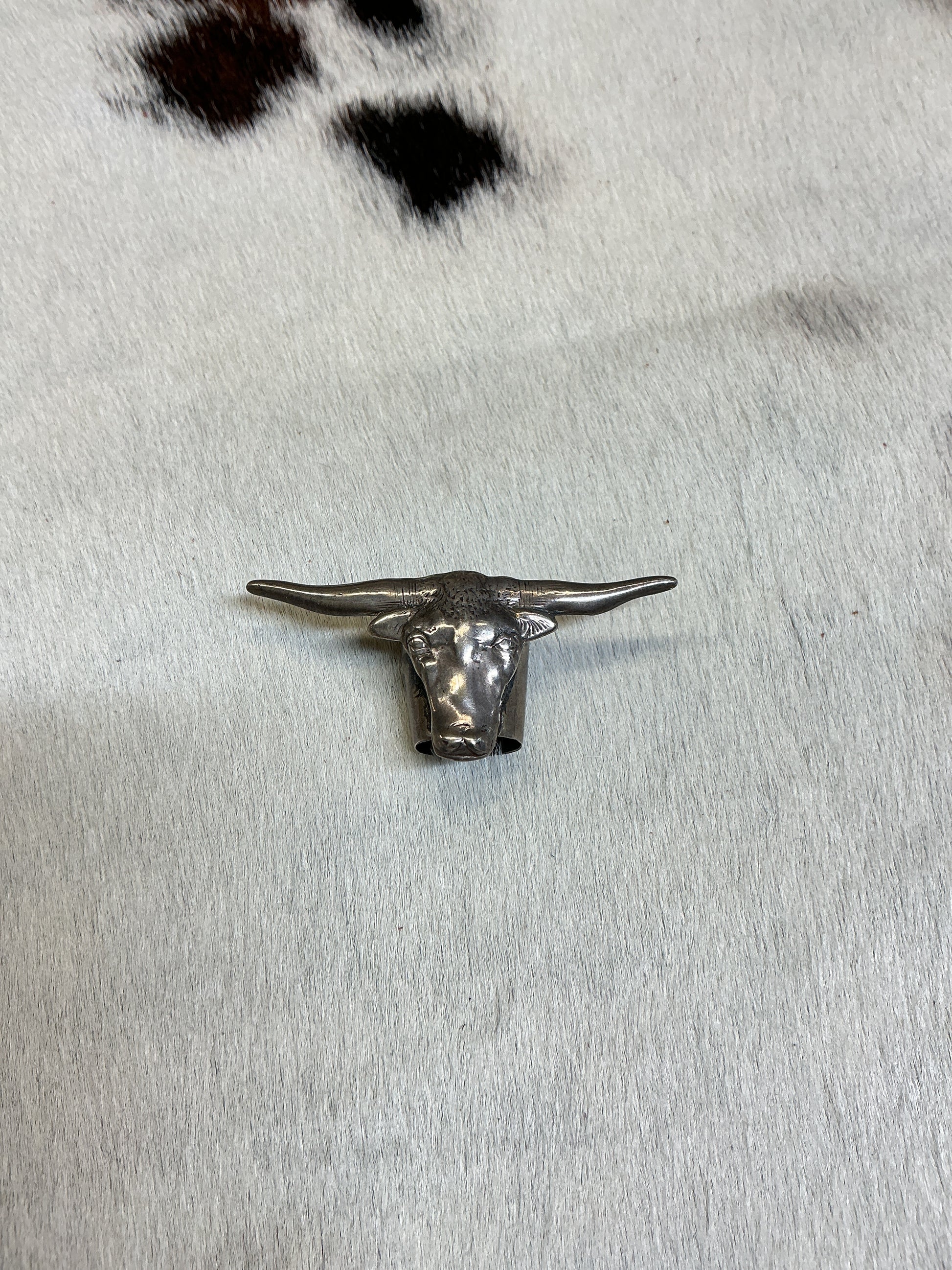 Sterling silver scarf slide with a longhorn head. The horns measure 1 3/8" and the head is 1" long.
