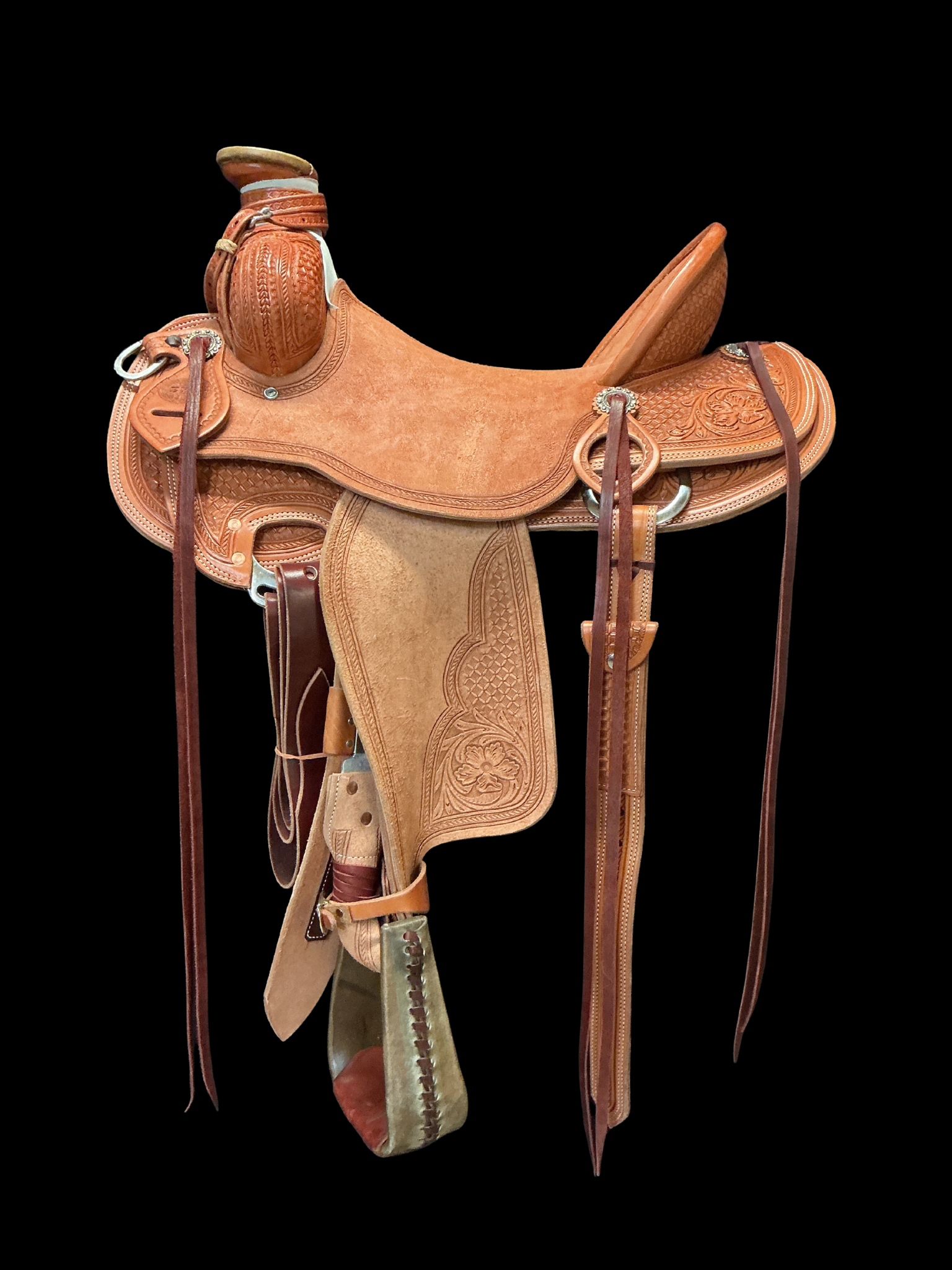 15 1/2" modified association saddle. Built on a rawhide covered wood tree and hand crafted with Wickett and Craig leather and natural sheepskin. Light oil half breed saddle with a rope border and basket/floral combo on a round skirt. Latigo, front and rear off billets, back cinch and stirrups included.